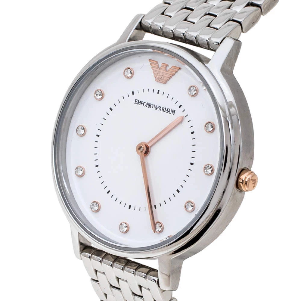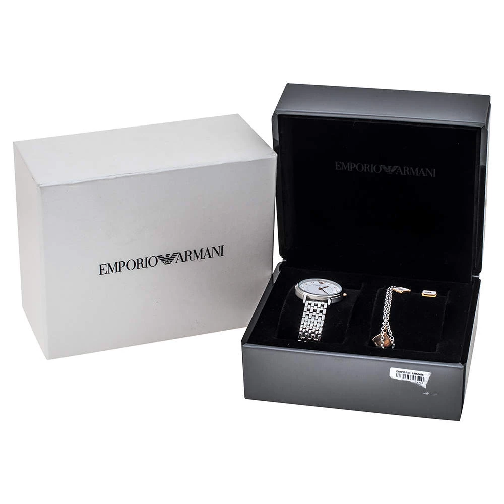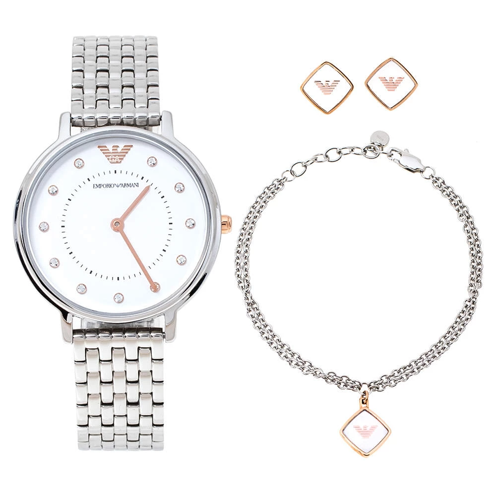 Gifts are always a wonderful way of showing how much you care about your loved ones! This Emporio Armani gift set comes comprising of a watch, earrings, and a bracelet. The AR80023 timepiece exhibits a stainless steel case that has a diameter of 32 mm and a white dial that flaunts two hands, stud hour markers, and the brand logo at the 12 o’clock position. Equipped with a water resistance of 30 meters, the quartz watch has a stainless steel bracelet that fastens with a push-button deployment clasp. The bracelet has been styled with interlocking chain-links that carry a diamond-shaped logo detailed charm and is secured using a lobster clasp. The earrings too are sculpted as diamonds and adorned with the brand logo in the center. Radiating sophistication and elegance, this gift set will prove to be an amazing buy.