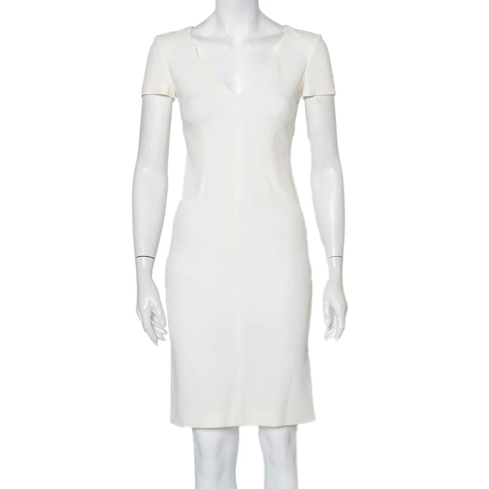 Minimal details and a beautiful silhouette make this Emporio Armani dress into a fashionable creation. It has a subtly scalloped V neckline, short sleeves, and a zip closure at the back. Pair the dress with dainty sandals or pumps to continue the elegant charm.
