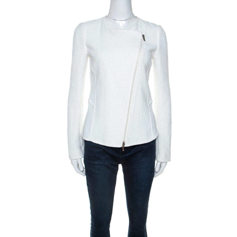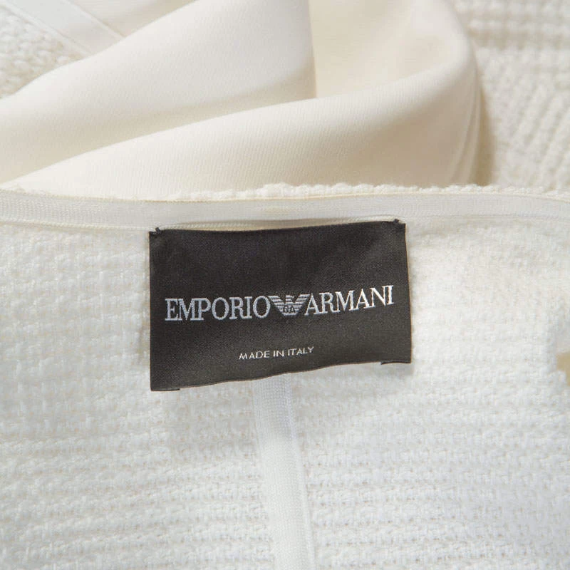 A blazer that can effortlessly enhance your formal outfits, this Emporio Armani blazer is cut to a fine-fitting structure featuring a waffle knitting design. Equipped with long sleeves, it carries a classic white hue, making the piece equally understated and dapper. Crafted with a blend of fabrics, the blazer is ideal to add a subtle charm to your winter ensembles.